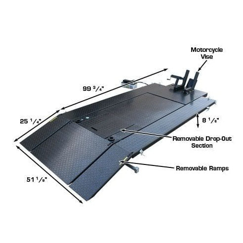 The Atlas® HI-RISE 1500 has an extra tall lift height of 43 inches. This increased lifting height makes it easier to work on vehicles while the operator is standing. This lift comes standard with a chopper extension making the center table 100 3/4 inches long and able to accept some of the longest choppers. The lift also comes standard with a side extension kit, with an overall table width of 51 1/8 inches, and is able to easily lift ATV’s, UTV’s, Golf Carts, Lawnmowers and other four wheel vehicles. The HI-RISE 1500 is the perfect addition to any service department of professional motorcycle dealers or equipment service shop or even a homeowner who wants to work on bikes or ATV’s in their own garage.