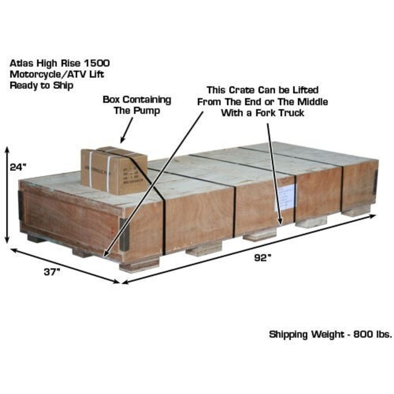 -The Atlas® HI-RISE 1500 is one of the industry’s most popular motorcycle and ATV lifts. This lift has a manufacturer rating of 1650 lbs. but we rate the lift at 1500 lbs., because we always under rate our weight capacities. The HI-RISE 1500 is powered by a high quality air/hydraulic pump which is included. This lift requires 100 PSI from an outside air source (not included).