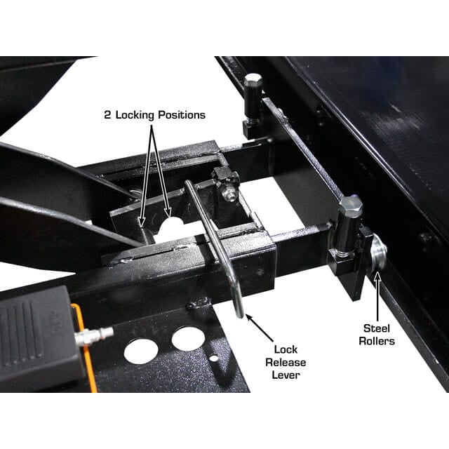 The Atlas® RJ8000 rolling bridge jack comes standard with a set of peg style truck adapters which increases the lifting height of the lift pads. These truck adapters will allow the RJ8000 to raise most pick up and larger trucks that will sit higher than the average passenger car. The RJ8000 rolling hydraulic jack features two solid locking positions that are used when the vehicle is to be suspended above the runways. When the locking positions are engaged, the hydraulic pressure from the lifting cylinder of the jack is eliminated. (These locks act much like a pair of jack stands after you lift a vehicle off the ground with a service jack).