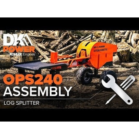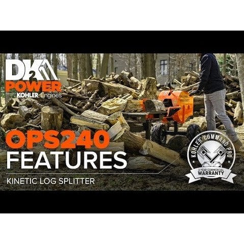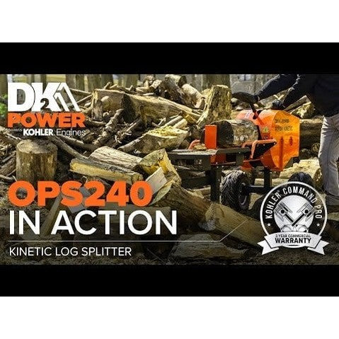 -Introducing the DK2 POWER OPS240 40-ton kinetic log splitter, powered by a KOHLER CH270 7HP 208cc Command PRO engine for outstanding performance. Equipped with an oversized reinforced steel work table, safety lockout and a clam shell quick-access body for easy use and maintenance. The OPS240 has an 8-inch expansion wedge and an auto-retracting bearing-guided ram to drive through logs up to 22 inches in diameter and up to 22 inches in length. Keep yourself safe while working with its extended stability stand and ATV locking wheels, keeping the splitter securely in place.