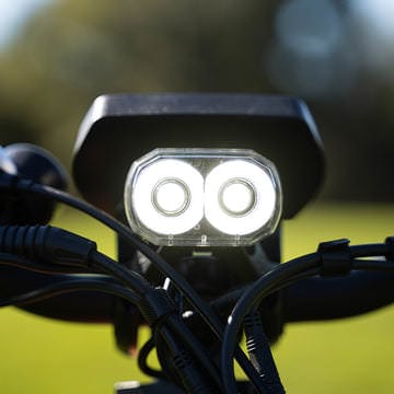 Light the path with the front light powered by the bike's battery. and the headlight is brighter than average, and really its just about bright enough to be your only source of light for a ride at night.