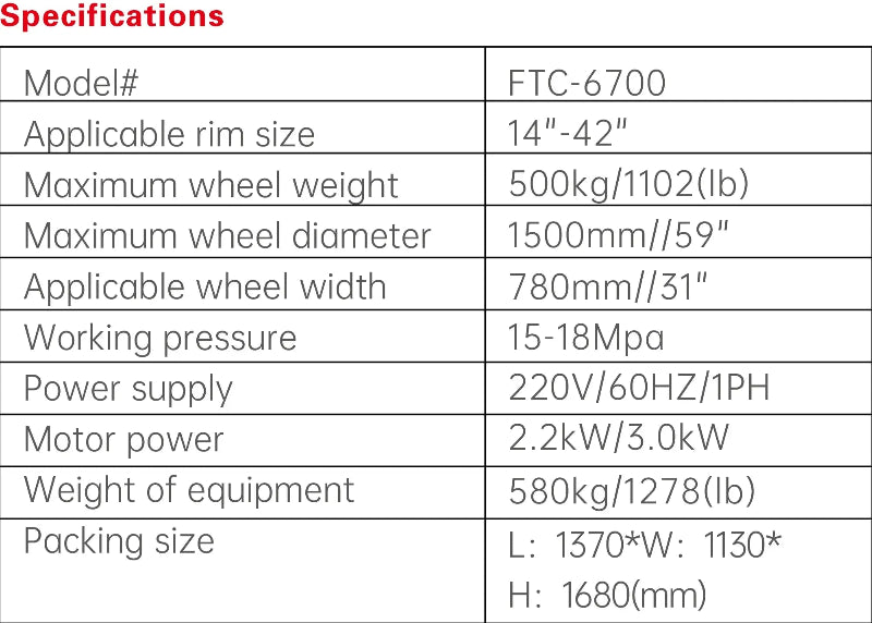 -Big wheels don’t have to be big problems. With a maximum wheel diameter of 59" and support for rim sizes from 14" to 42", the FTC-6700 is purpose-built for shops that regularly see commercial and fleet work. It also handles demanding assemblies up to 1102 lbs, giving you the capacity to tackle heavier jobs with confidence—while maintaining a controlled, deliberate operating feel.