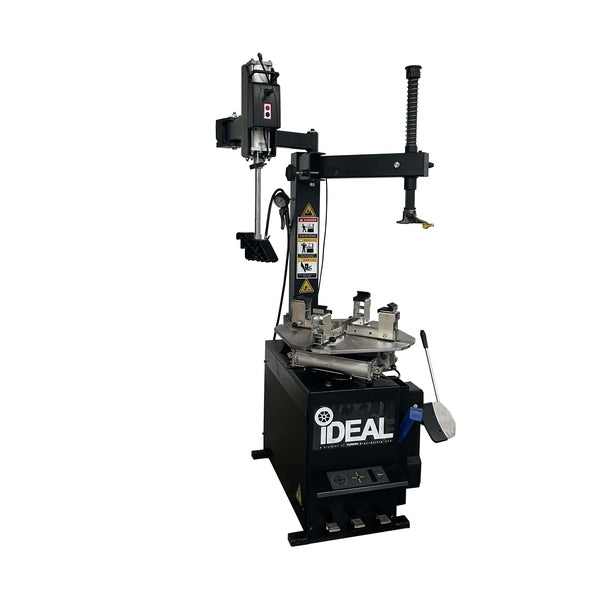 The iDEAL motorcycle tire changer is specifically designed for changing motorcycle and ATV tires with an outside clamping range of 6 24 and includes an Assist Arm to facilitate changing tires that are low profile and/or stiff sidewall. The design includes raised clamps to allow for clamping of most motorcycle wheels with disc brakes and drive components still installed. Our clamp is designed to limit damage to the clamped wheel as all touch points are plastic. In addition we provide both an ATV (smaller) and motorcycle (larger) demount head that includes plastic protection to wheels. The design includes a powerful bead breaker and a hand held inflation gun.