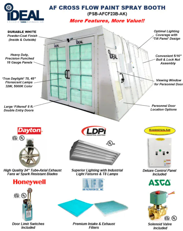 -The iDEAL PSB-AFCF23B-AK Cross Flow Draft Paint Spray Booth is a commercial-grade, A-Frame style booth built for clean finishes, consistent ventilation, and bright, even visibility—without forcing you into a premium price bracket. It’s engineered around an efficient cross-draft airflow path that pulls clean, filtered air through the front intake filters, carries overspray and vapors smoothly across the work zone, then captures and exhausts through a rear filtered chamber and upward discharge. The result: a safer, more controlled spray environment—and paintwork that looks like it came out of a higher-end booth.