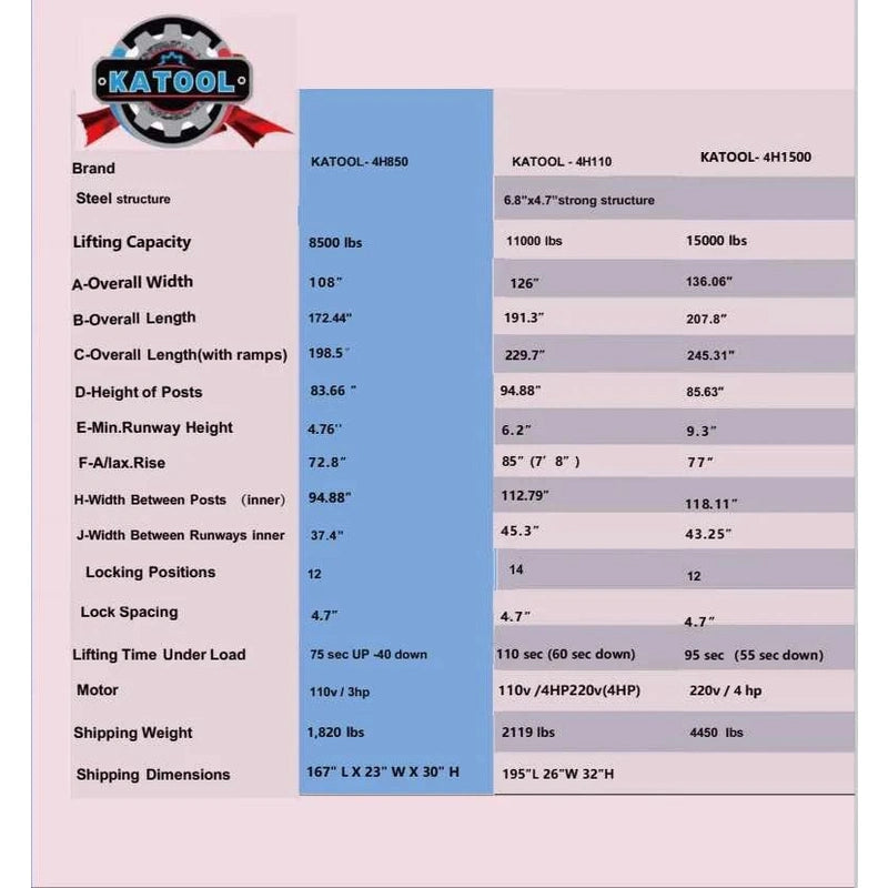 -The Katool KT-4H850 8,500 lbs Heavy Duty 4-Post Car Lift is your dependable solution for robust lifting, offering an impressive 8,500 lbs lifting capacity. This CE-approved and certified lift meets 115% dynamic loading capacity standards and passes rigorous 150% static loading capacity tests, ensuring top-tier performance and safety for your garage or workshop.