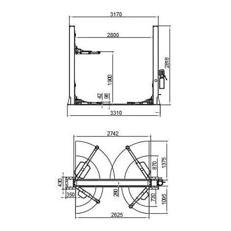 -The Katool KT-H120D 12,000lbs Two Post Lift is a robust auto lift designed for powerful performance. With a lifting capacity of 12,000lbs, this 2 post lift ensures efficient and secure lifting. The manual safety release from a single side adds convenience and safety. Featuring a symmetric arm design, base plate configuration, and dual hydraulic chain-drive cylinders, it guarantees stability during operation. The lift is equipped with rubber pad door opening protection, screw-on pads, and extension support adaptor sets of +100mm for added versatility. Powered by a top-level hydraulic system, it operates seamlessly with a 220V/60HZ/1PH configuration.