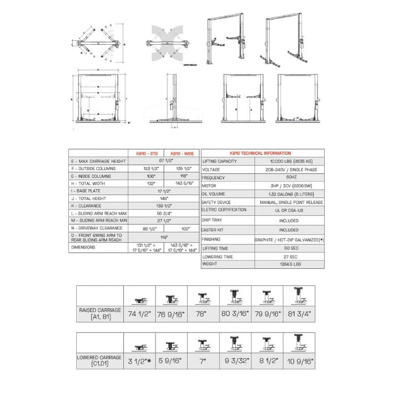 -Fast lift cycles keep your bay moving. The KB10/H raises vehicles in about 50 seconds and lowers in about 27 seconds, balancing speed with controlled operation.